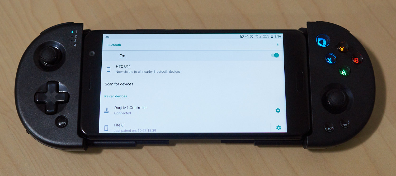 The Daqi M1 connects to your phone or PC via Bluetooth 4.0. Pairing is fast and straightforward, and the connection is stable. I like that it connects almost immediately upon powering on via the physical power slider. Also handy is that you can pair it to a couple devices and it will connect to whichever it sees first. This means that you can pair it with your Android phone and Windows 10 PC (for example) and switch between the 2 without having to re-pair. Also appreciated is the fact that the buttons map exactly as expected to the standard Xbox layout so everything just works right out of the box with pretty much any game you can throw at it.